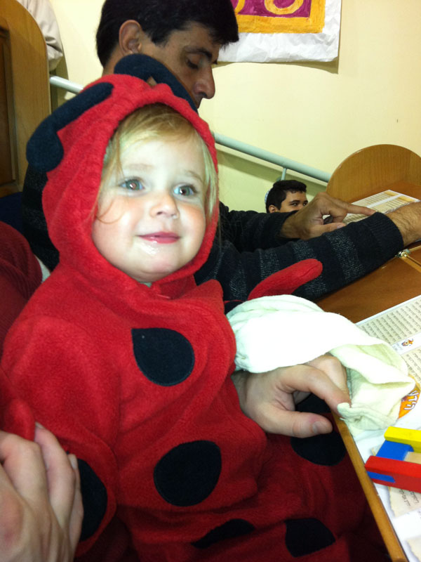 Friends of ours organised a local megillah reading, complete with pre-performance for kiddies and the rest. Unfortunately the Israeli love-affair with Very Loud Boomy Music made it difficult to hear what was going on and I think it scared the little ones. Yaron, being only 6 months, barely made it past perek alef before screaming loudly at the Hamans. So that was the end of my megilla reading! I spent the next half hour circling the building singing Twinkle Twinkle Little Star whilst Israelis with little children who seem to think staying up tilo 10 at night is no big deal stared at me from behind their costumes. Jojo was asking to go home after only a few lines, but he sat it out. I later found out about a few megilla readings for women with small children but of course it takes a while to acquire local knowledge. Oh well. The next morning I was informed of a local family who were reading it at their home, so I took Jojo along who spent the entire 22 minutes pointing at the bearded father saying “Rabbi Rabbi” [as it turns out he was right about that one] and playing with his raashan [noise-maker] but of course only in the quiet bits. Eek. Anyway the family were very kind and pressed mishloach manot [food parcels] into our hands as we left. So Jojo was introduced to the world of Israeli chocolate and would you believe, he actually liked it? Have I taught him nothing???