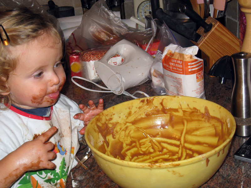 Earlier that day I felt a little sorry for Jojo having a miserable mummy so I put on some cheery music and finally gave in to his request to bake a chocolate cake. Usually we only bake healthy cakes during the week, saving the sweet ones for shabbat, but he approached me with this lovely recipe book I was given as a wedding present which is devoted ENTIRELY to chocolate cakes. I have always stared at it longingly but never quite been able to follow it. Anyway, Jojo looked at me beseechingly, begged “cake, cake, chocolate” and then marched over to the cupboard where he started pulling out flour and sugar. It seems sometimes he is a little too much like me. So after about 2 minutes I gave in and we made these fabulous Chocolate Coconut Fingers. We were both covered in chocolate by the end (all innocent I assure you) as was my kitchen but it was great fun. And I was very impressed at myself for following a recipe in ivrit. Well done me.