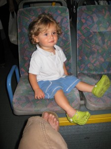 Jojo, mind you, loves public transport. He gets to sit on our laps (rather than being tied to a chair, can’t be much fun) and has women cooing over him on every journey. They constantly call him a “chamudah” (girl sweetie) and I have to tell people he is actually a chamud (boy version). For him the buses provide huge entertainment (I am the woman singing “The Wheels on The Bus” that nobody wants to sit next to) and the trains are an opportunity to run around trying to get as many women as possible to smile at him. He normally gets around a 95% hit rate. I am wondering what sort of career this will lead to, but at the moment it’s really handy as Husband and I can simply do a Wayne & Waynetta Slob (from Harry Enfield, circa 1994) scene when we board:
