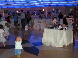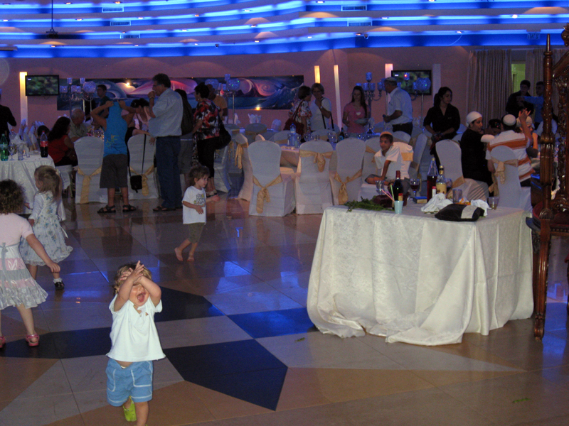 Anyway I got hold of the mohel’s card, just in case we need him (apparently he shlepps all over the country and only asks for what people can afford, a true mensch) although I didn’t get much chance to interview him. He sat at our table and was quickly brought his meal and as he looked rather hungry I decided to leave him be, since in my experience it’s never a good idea to come between a man and his meat. The food was truly wonderful, it seems that one gets a lot more for ones money in terms of cuisine, which is something we discovered when organising our wedding here, years ago. The salads in this country are inspired, and people do amazingly creative things with aubergines. Jojo ate like a king and after helping me with giant slab of chocolate-thing dessert decided to burn off his sugar rush by running and spinning all over the place and chasing a little girl about his size in a red-checked dress. What a goer.